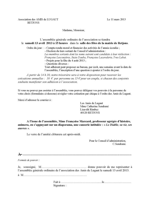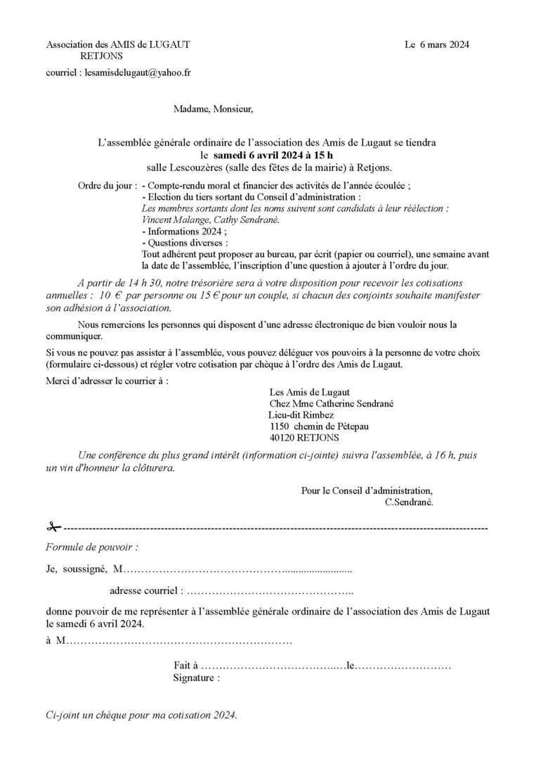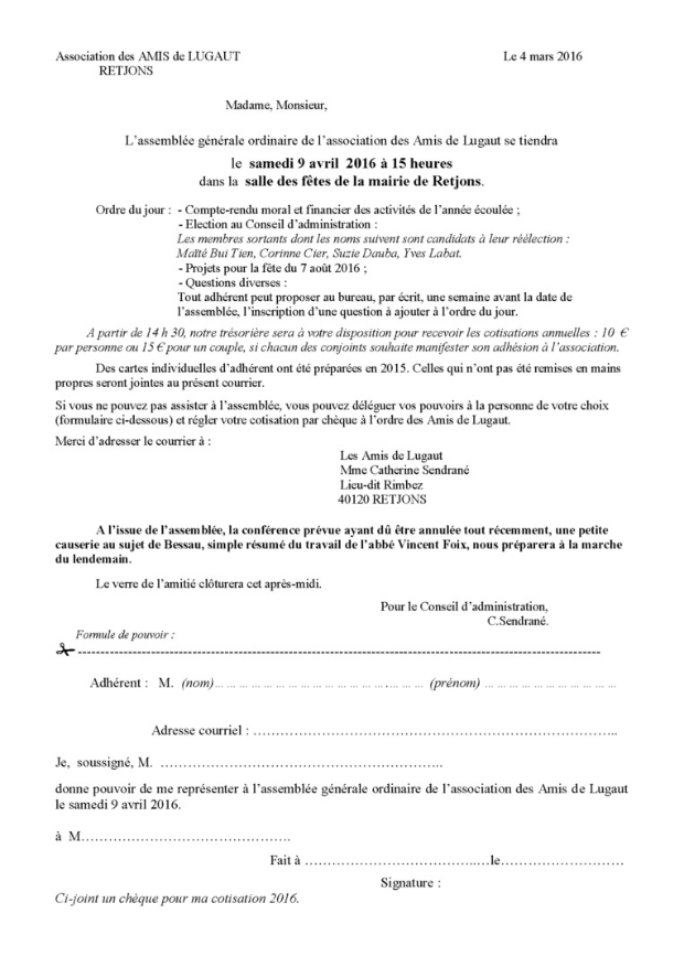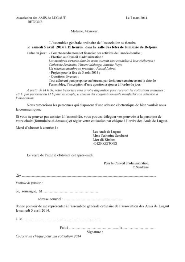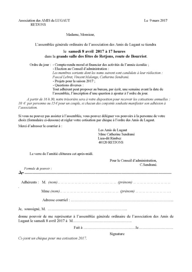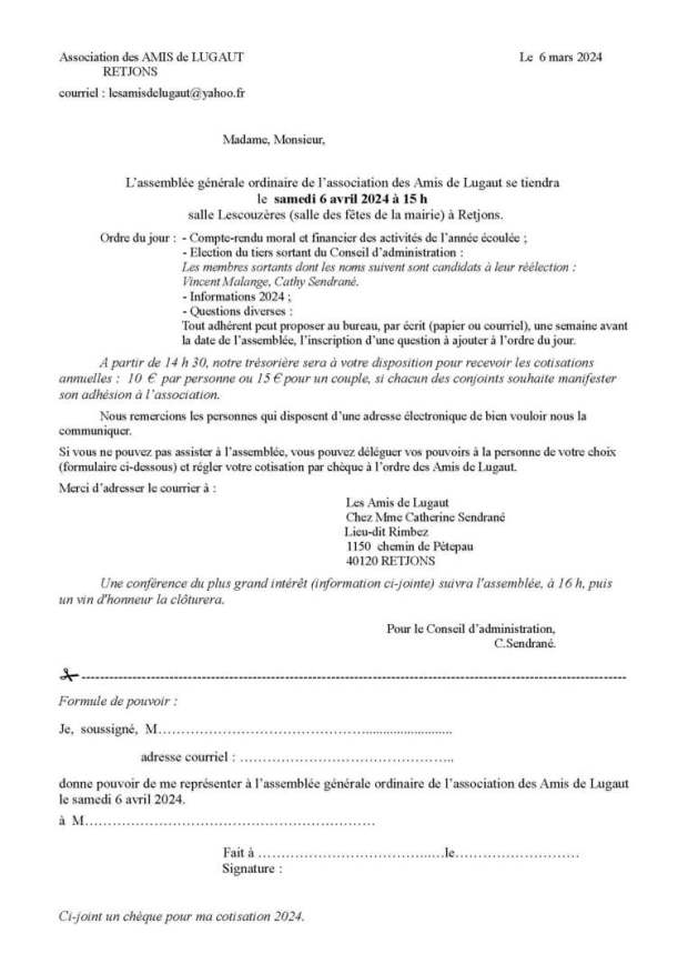 Si vous ne pouvez pas assister à l’assemblée, vous pouvez déléguer vos pouvoirs à la personne de votre choix (formulaire ci-dessous) et régler votre cotisation par chèque à l’ordre des Amis de Lugaut.