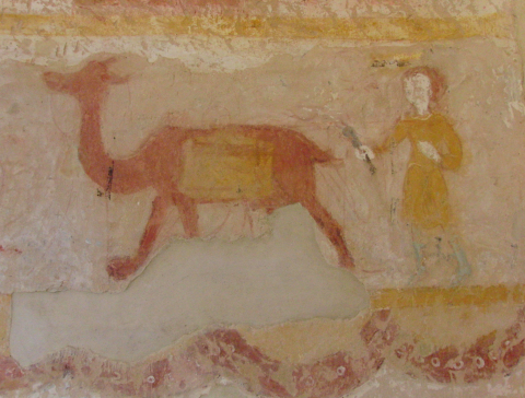 Ein Dromedar mit Packsattel wird von einem Kameltreiber geführt.