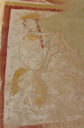 Un personaje desnudo a caballo de lo que podría ser una sirena (cabeza de mujer, cuerpo de pez y patas de león).